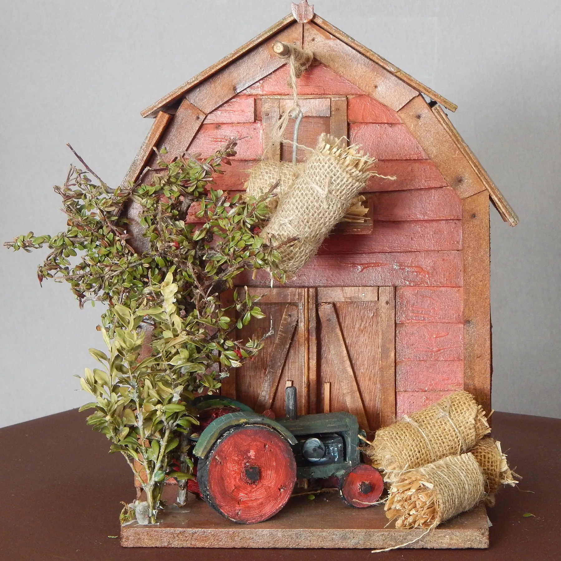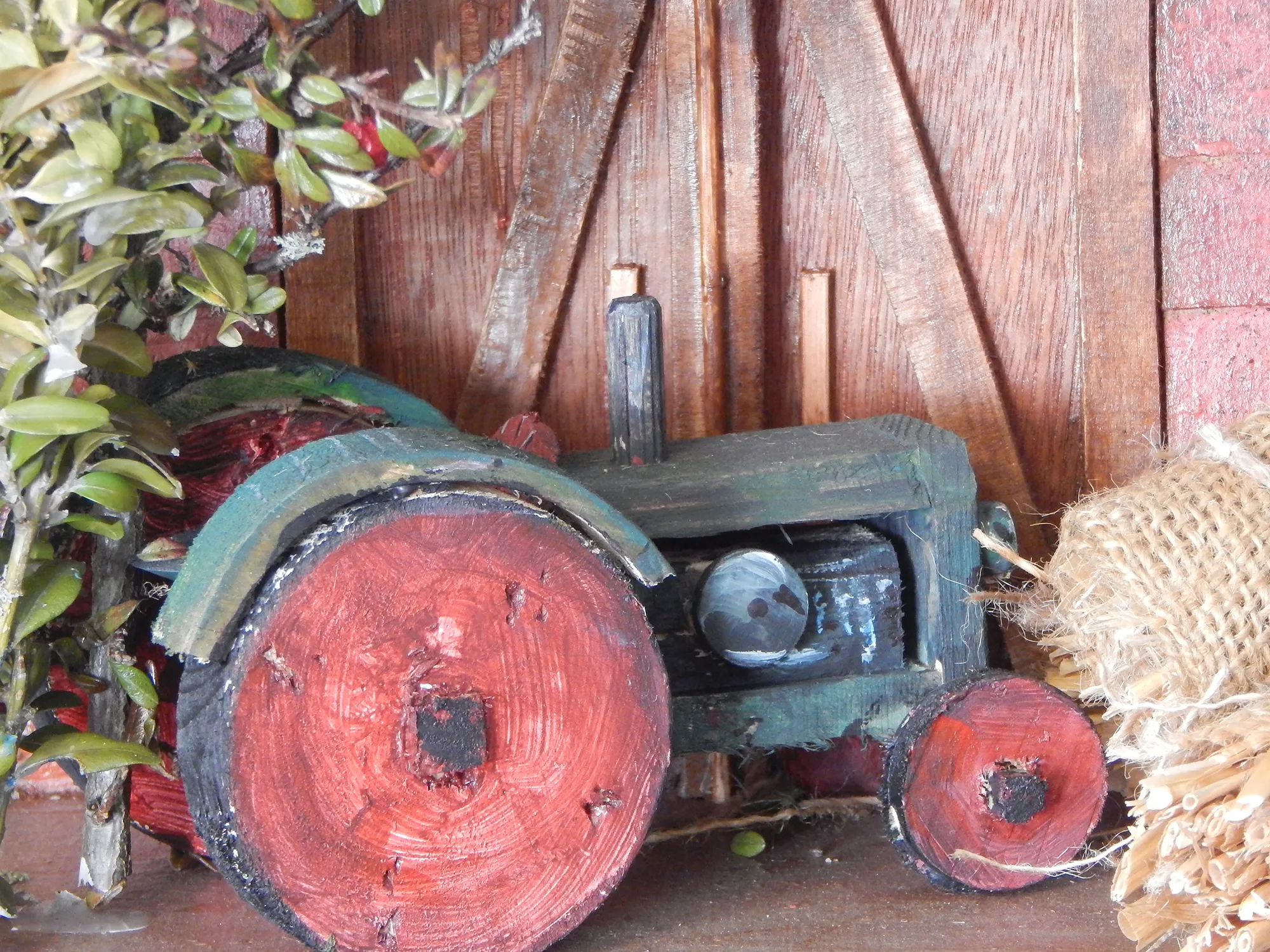 Rote Fassade mit braunen Balken und Dach und einem grünen Traktor.