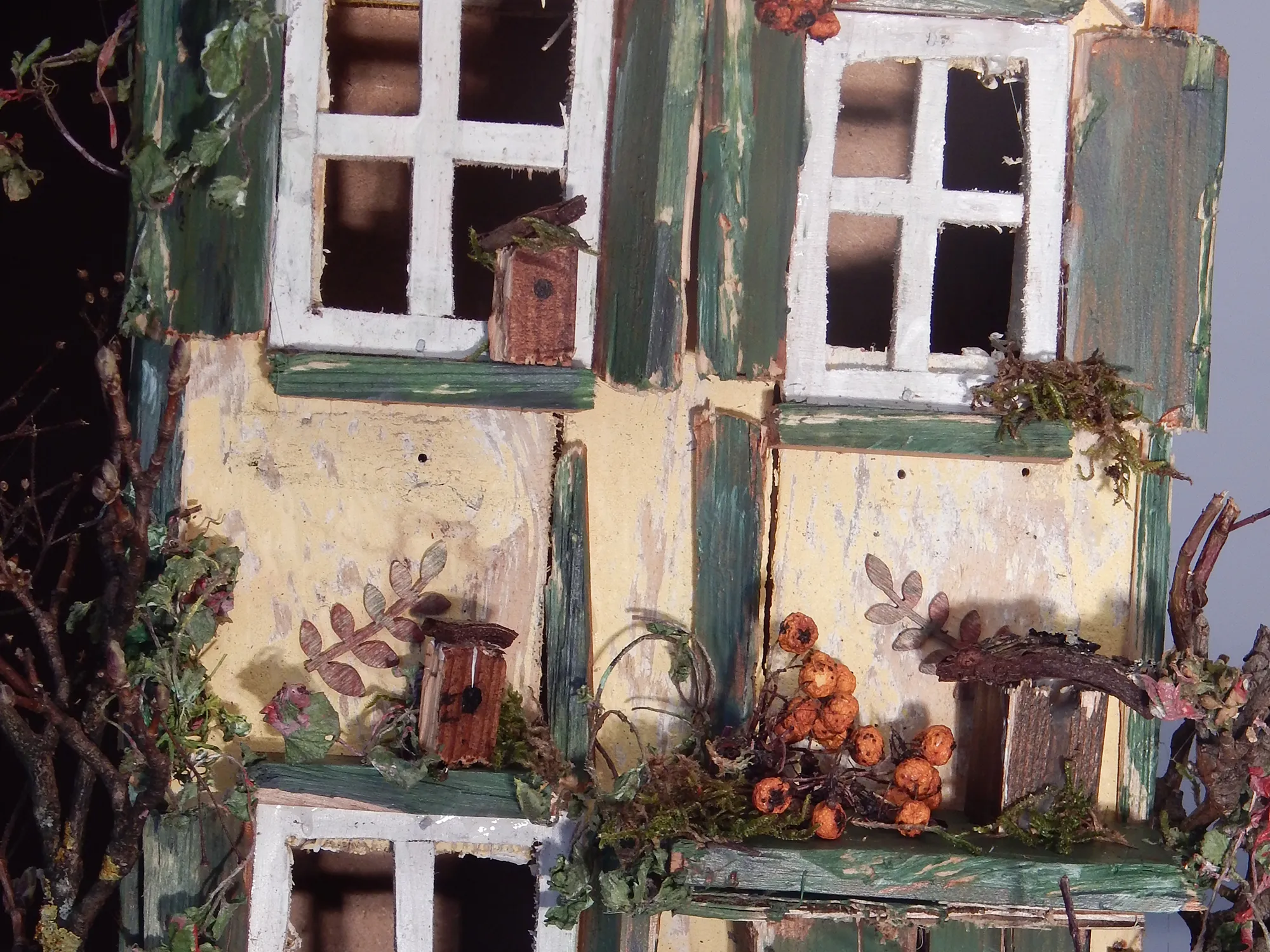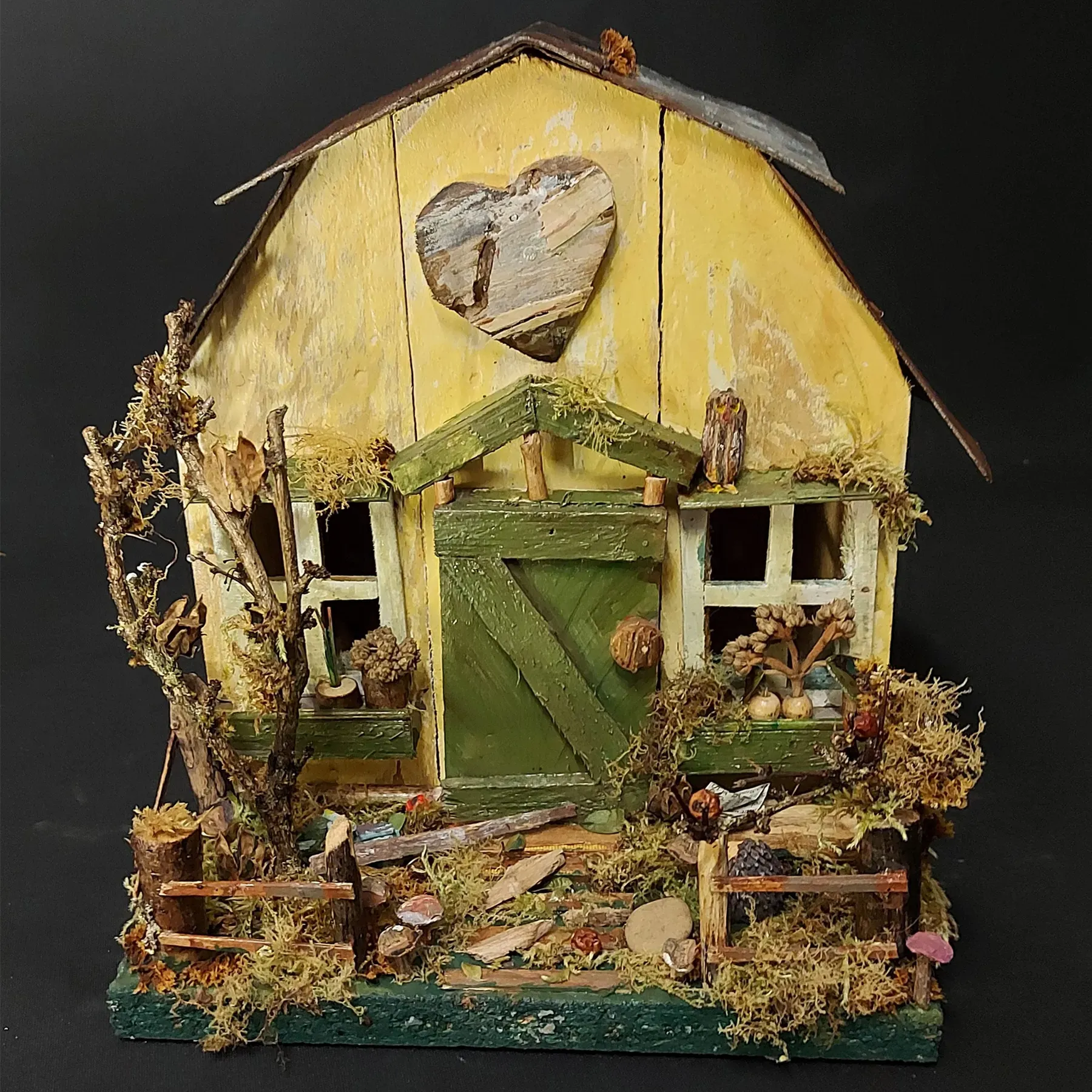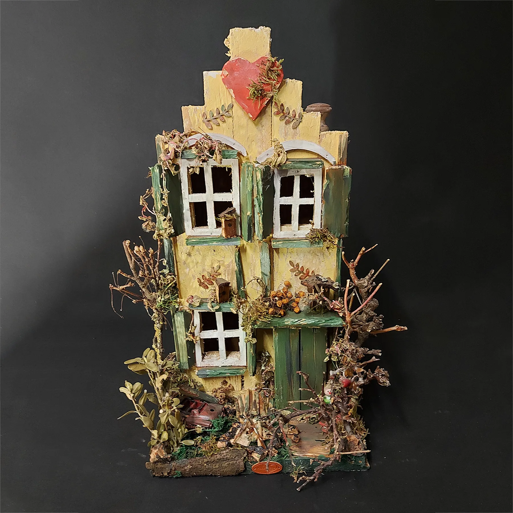 Gelb gestrichenes Äußeres mit grüner Fensterbank und Tür.