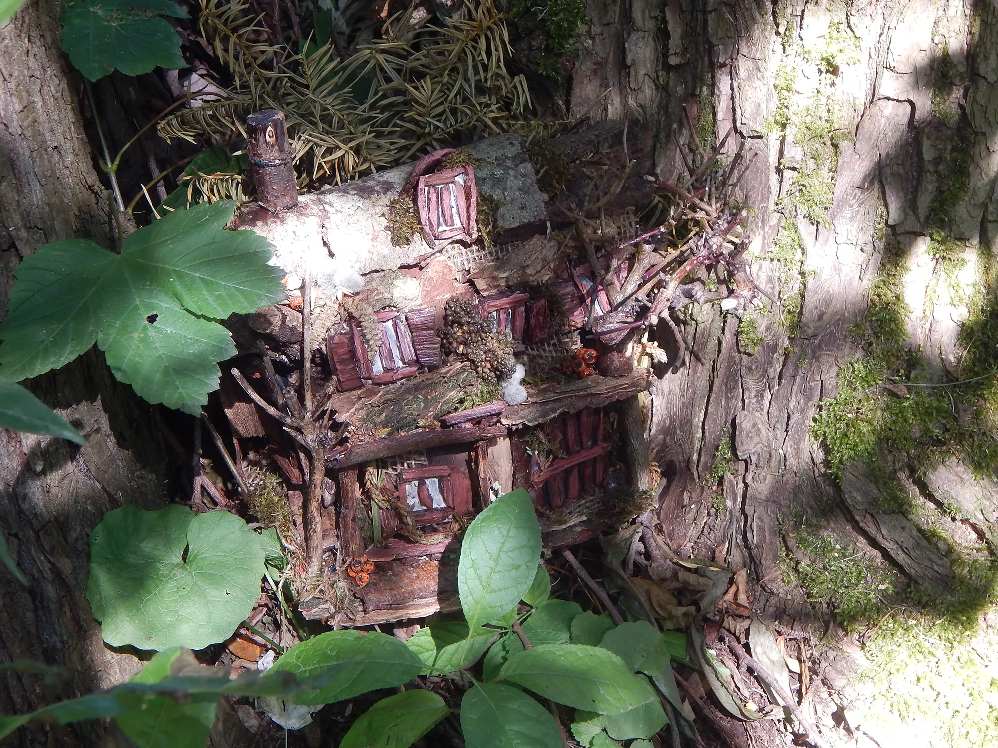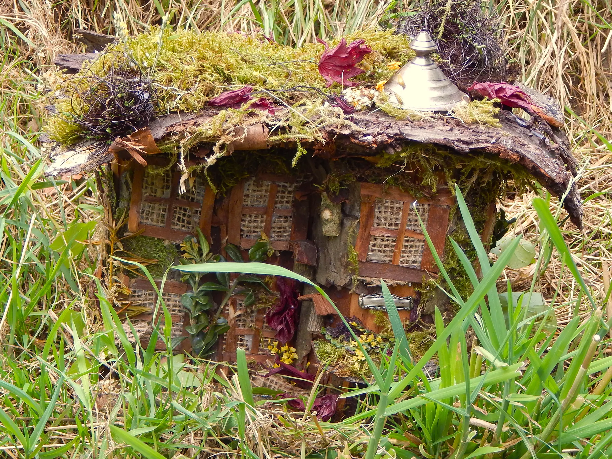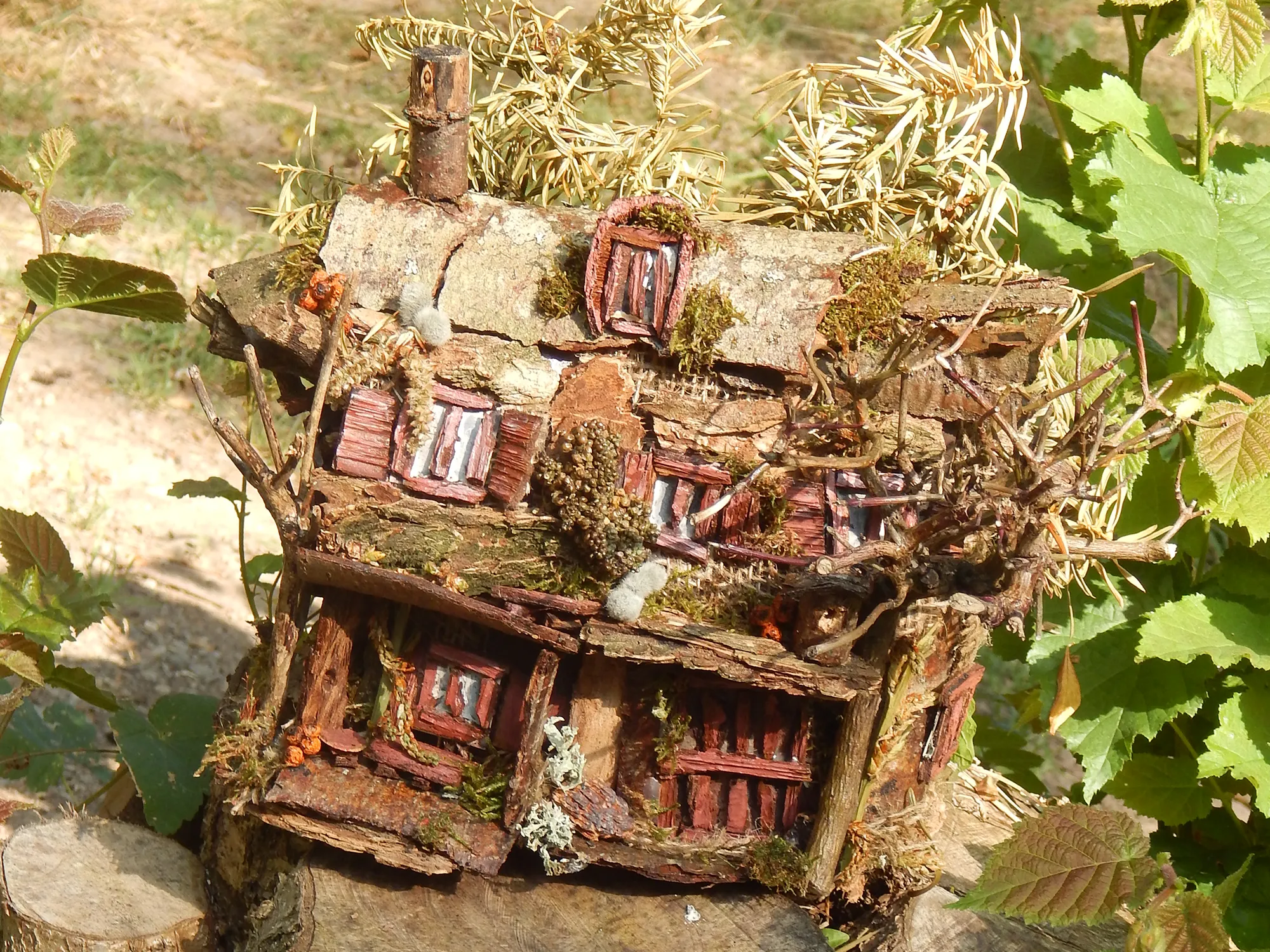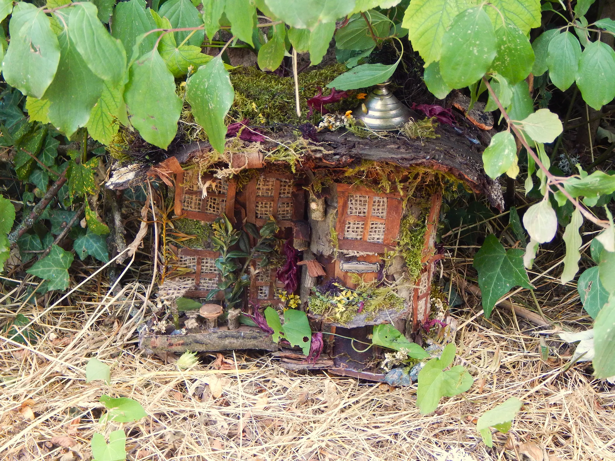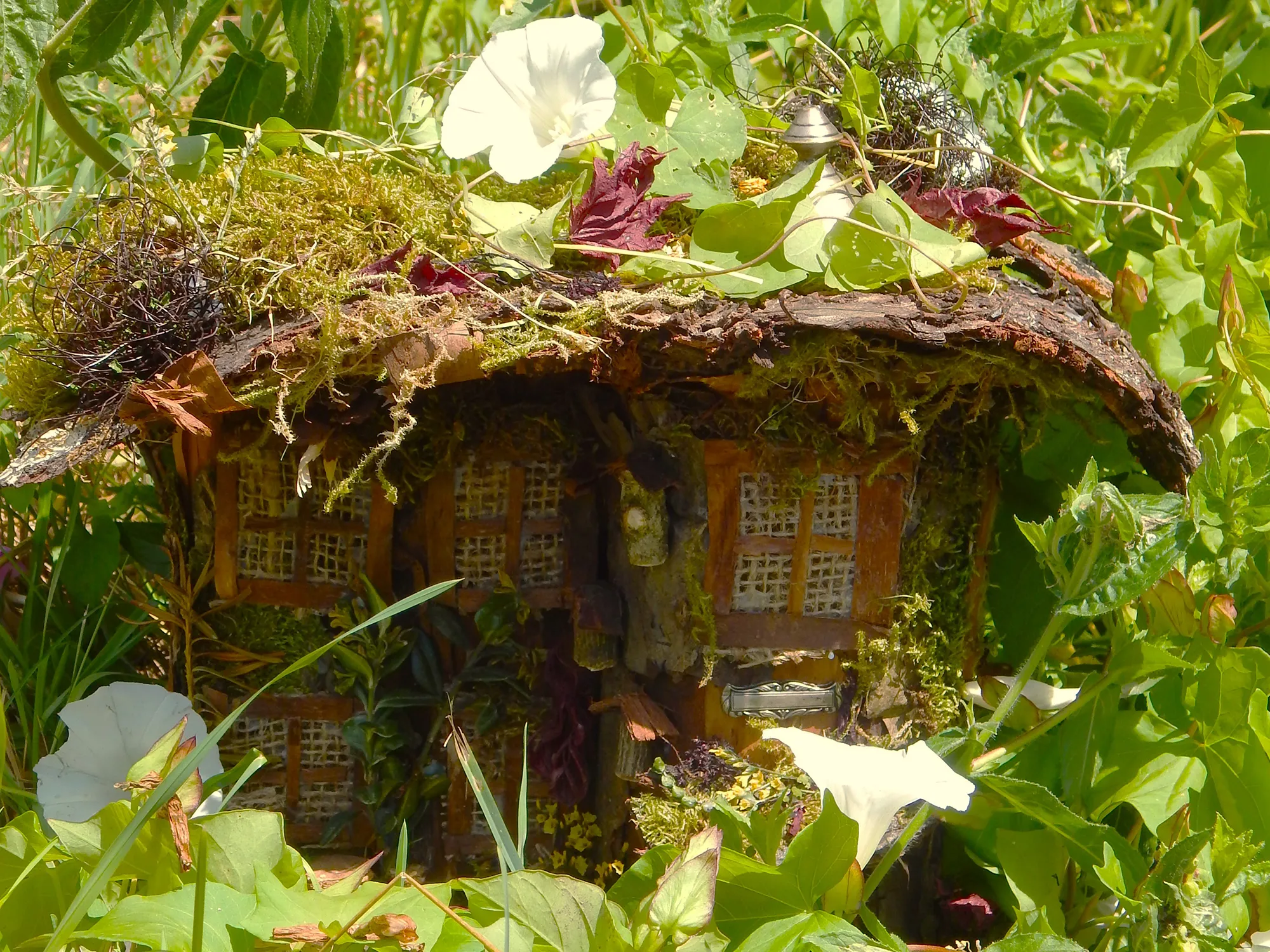 braun/graue Fassade mit grün lilanen Dschungel Accessoires.