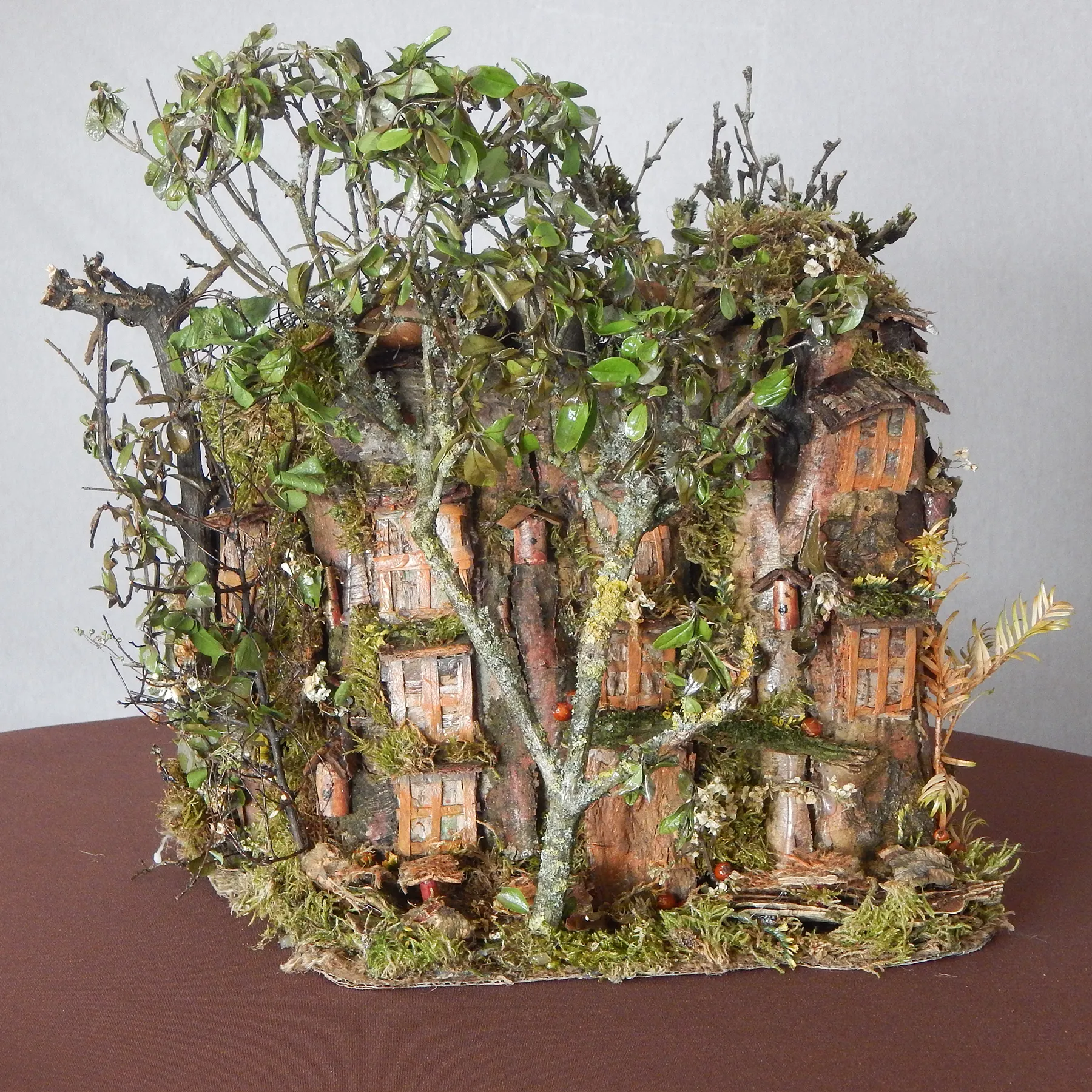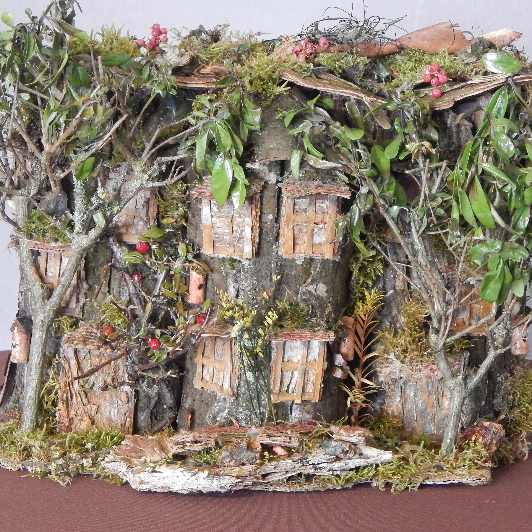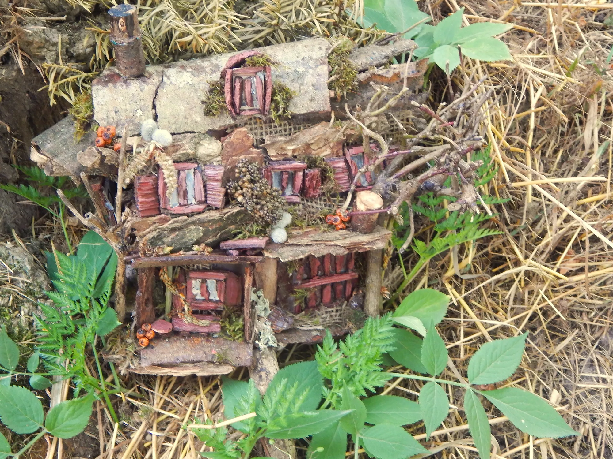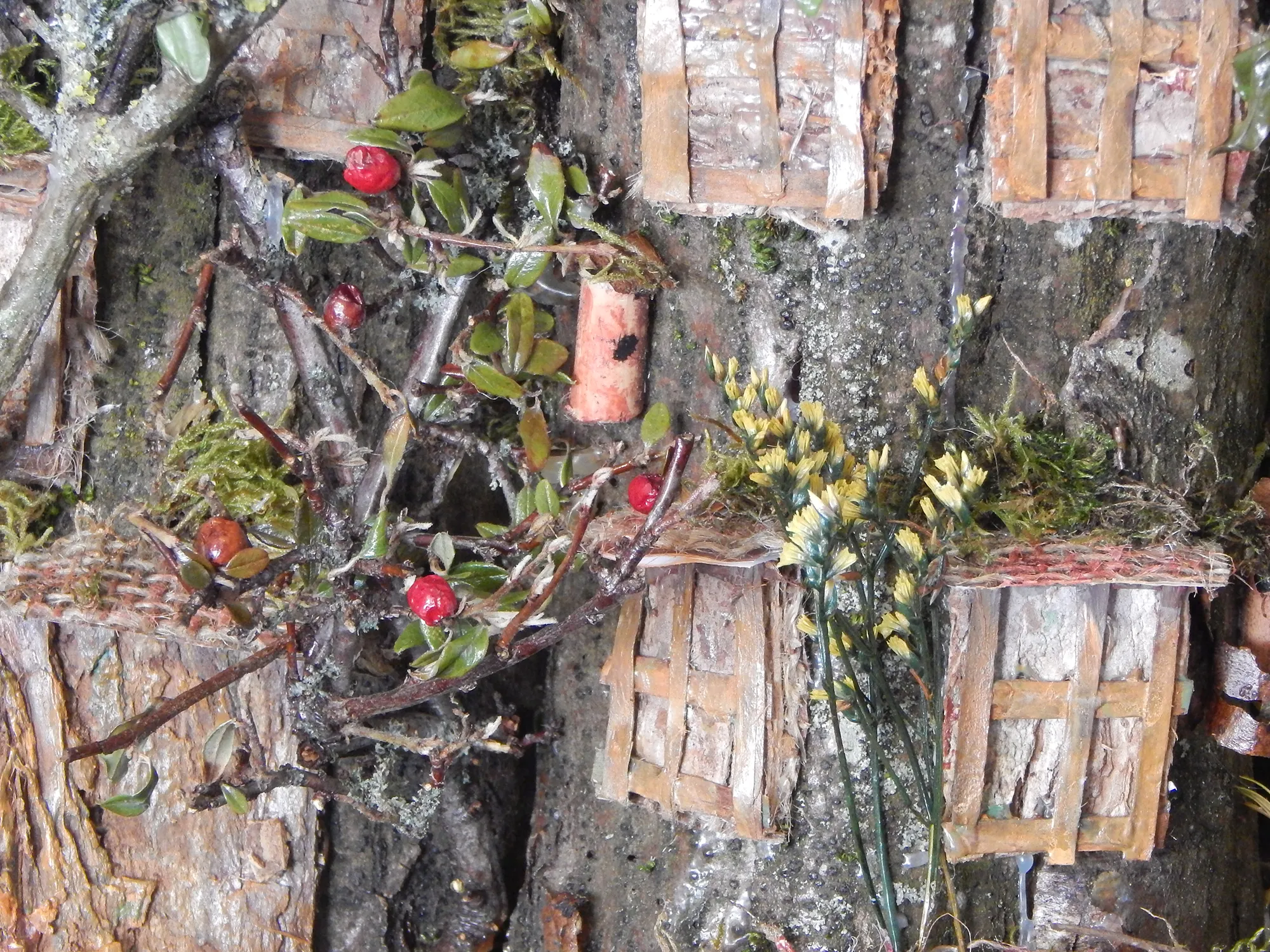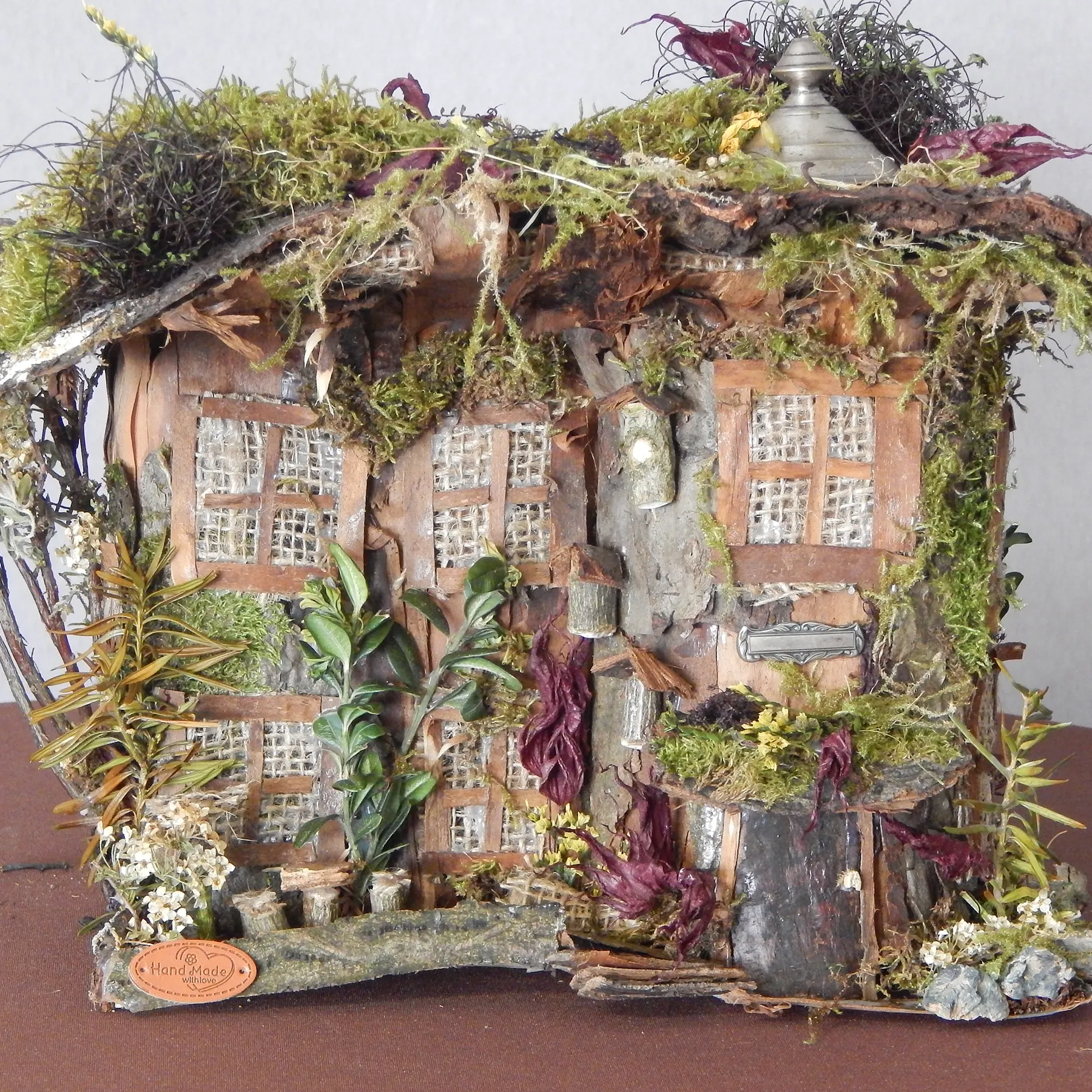 braun/graue Fassade mit grün lilanen Dschungel Accessoires.