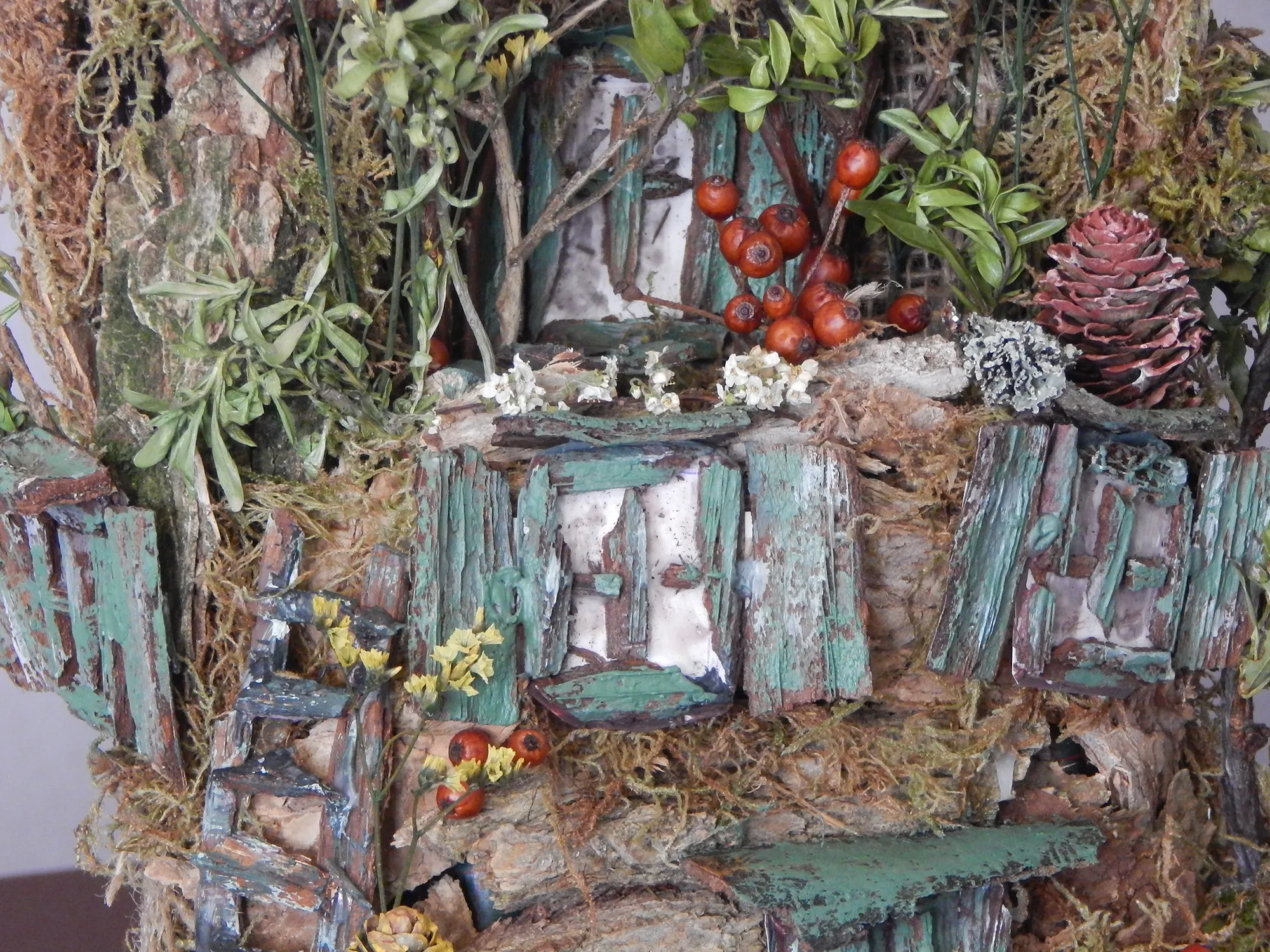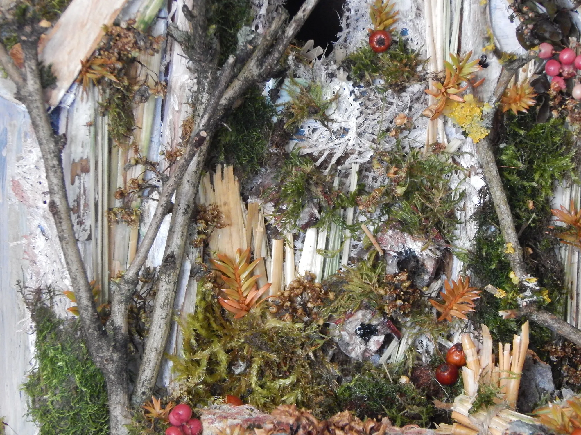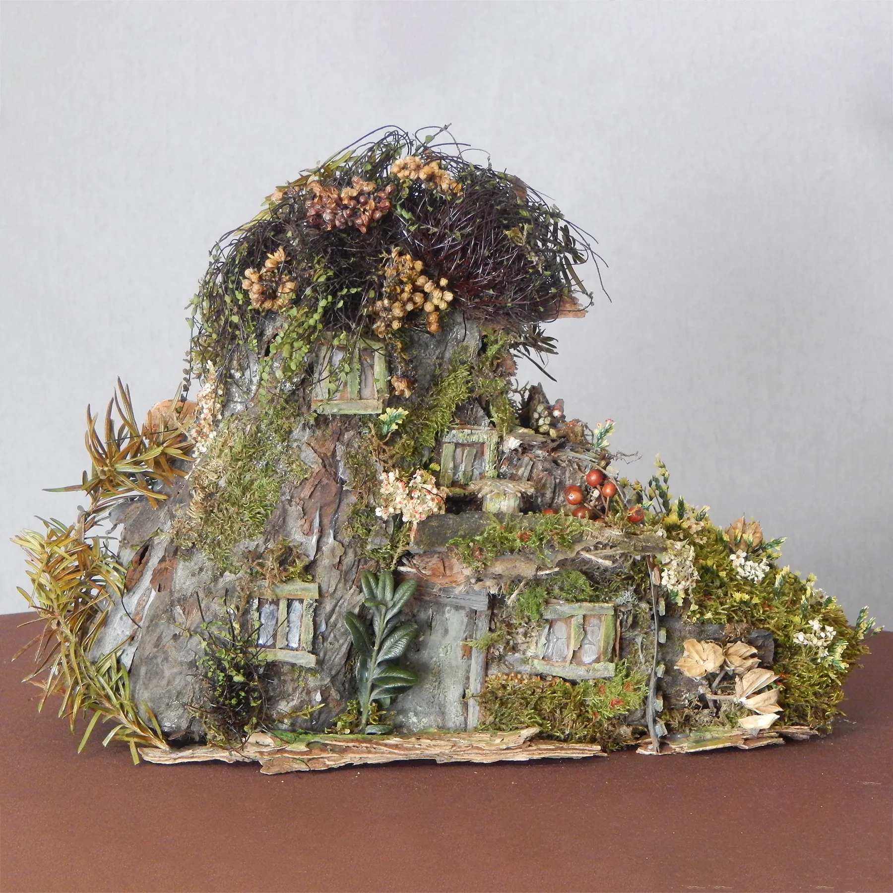 Braun mit grün bewachsenem Moos, sowie rot und orangenen Beeren.