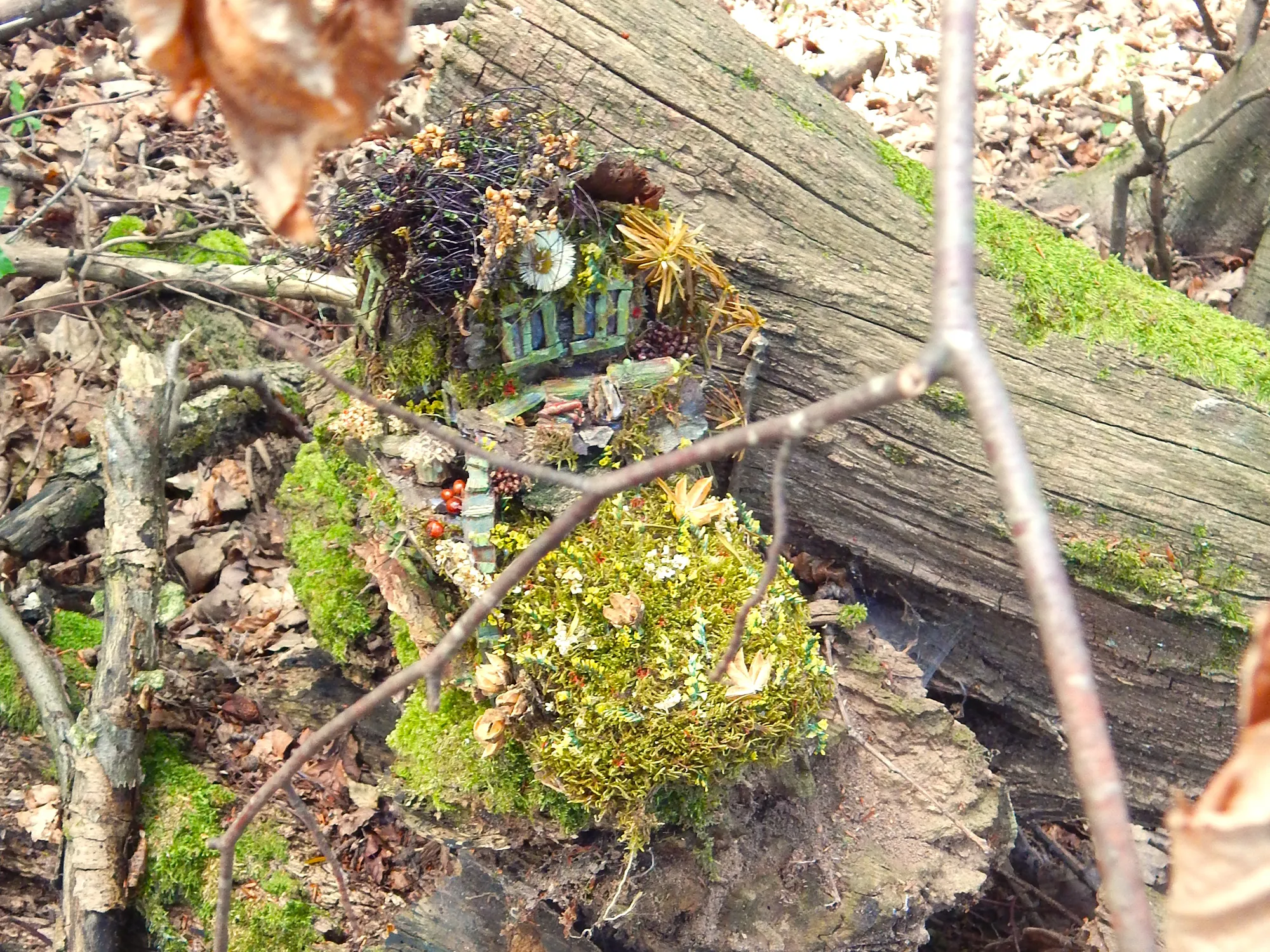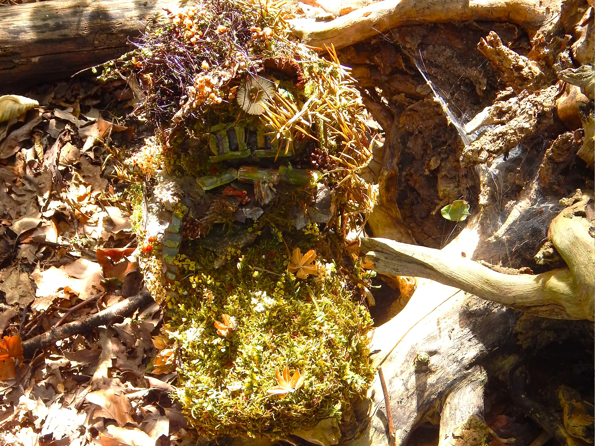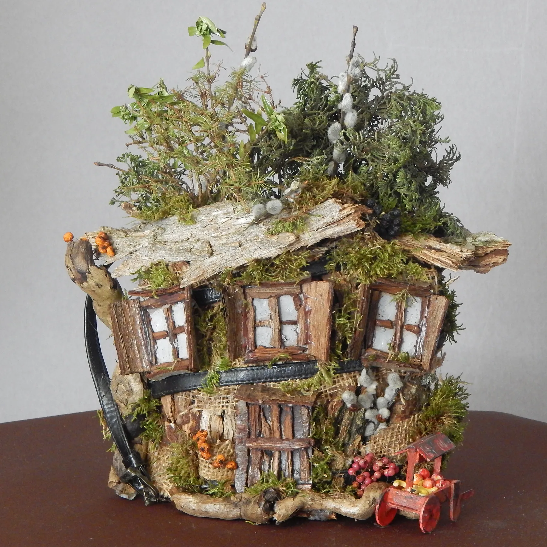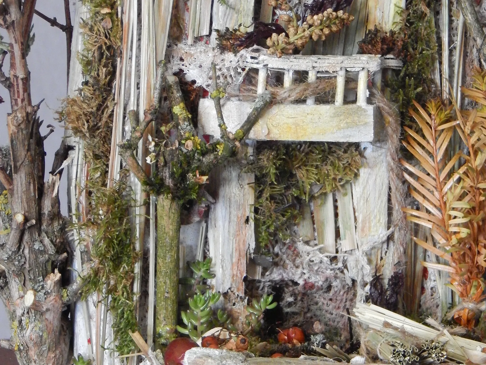 Braun mit grün bewachsenem Moos, sowie rot und orangenen Beeren.